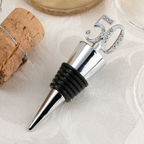 A 50th anniversary isn't perfect without this stylish wine/champagne bottle stopper. Measuring 3.75" in length, the silver-plated stopper has a black rubber seal to preserve freshness. The number "50" at the top is accented with rhinestones. read more..