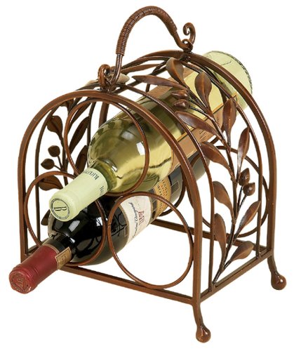 This beautiful 9 inch tall table top 3 bottle wine rack has metal olive leaves and olives all along the side arch. The rack has a wonderful bronze enamel finish that adds warmth to kitchens, dining rooms and dens.It measures 9 inches tall (12 inches including the carrier handle), 9 1/4 inches wide and 6 1/4 inches deep. It makes a great housewarming present.