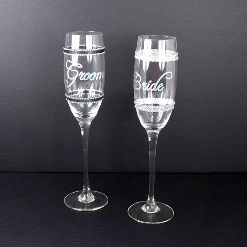 Celebrate your finest moment with this set of elegant " Bride" and " Groom" rhinestone accented champagne flutes. Black accent for Groom and White accent for Bride. They perfect for your wedding toast! read more..