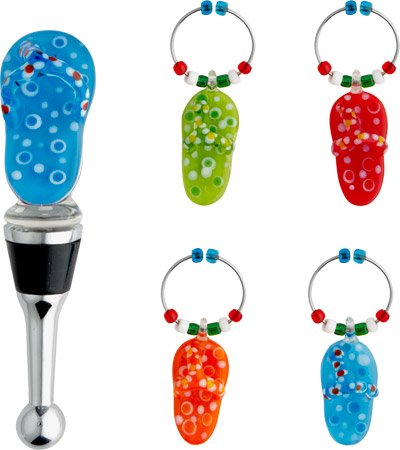 - Set of four differently colored flip flop art glass wine charms with matching flip flop bottle stopper