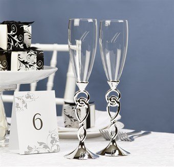 Set of 2 champagne glasses. Silver-plated knots form the stems of these unique toasting flutes. Each is 10-1/2-inch tall. Hortense B. Hewitt offers an assortment of styles for today's bride. Among these wedding accessories, you'll find affordable and stylish contemporary and traditional accessories - from modern and whimsical to traditional and classic. You are sure to find the perfect wedding accessory or gift from Hortense B. Hewitt. read more..